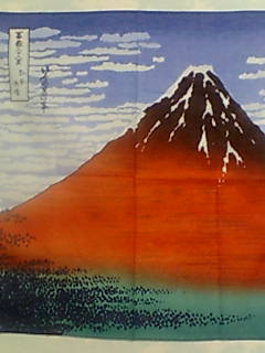 写真は北斎の『富岳三十六景』“凱風快晴”・・・・・・のハンカチ(笑)。私の部屋の壁に張ってあります。600円ナリ。窓っぽくていい感じ。飽きたらお弁当ナプキンにする。